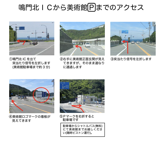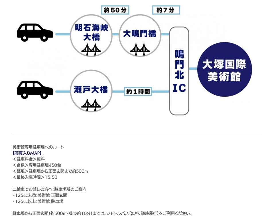 ゴールデンウィーク3日目に家族で行きましたが、鳴門北インターを降りて左折のはずが「美術館は右折」との誘導が。駐車場が満車のため3キロ以上離れた第4駐車場(黒崎駐車場)へ誘導されました。