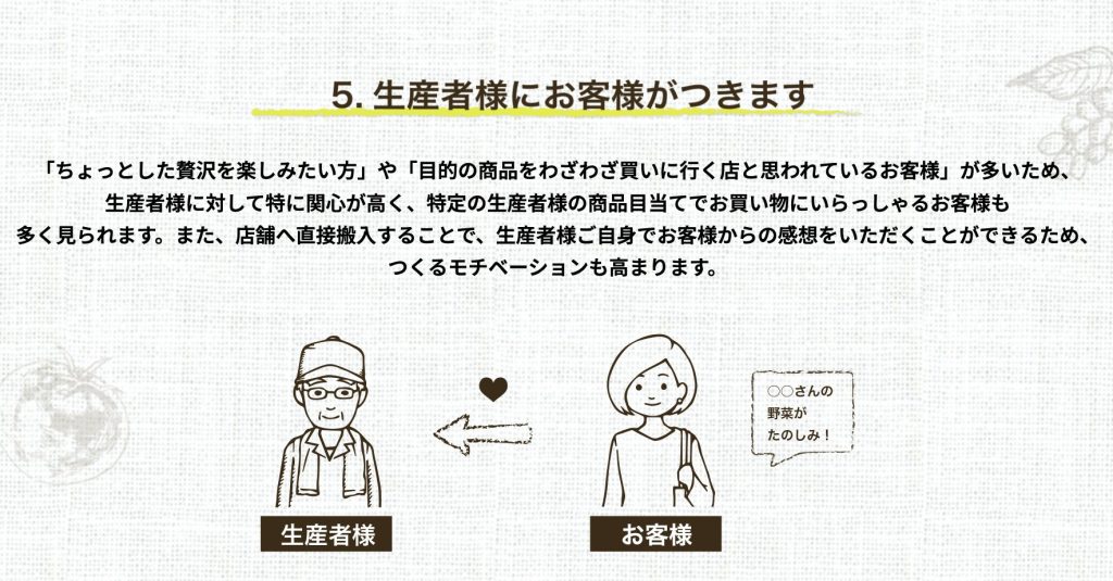 生産者が直接店舗に納品することで、顧客からのフィードバックを直接受け取ることができます。